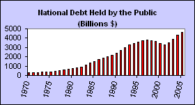 The Budget Deficit vs. the National DebtNote: Large images are available for viewing by clicking on the smaller images on this page.A budget deficit is the amount by which the federal government's outlays exceed its revenue in a given year. If, for example, the government collects $700 in tax revenue in the year but spends $900, the budget deficit is $200. (Correspondingly, the budget surplus is -$200.) The national debt is the federal government's total indebtedness at a moment in time. It results primarily from previous deficits. The difference between the budget deficit and the national debt is the difference between a flow (something measured over a period of time) and a stock (something measured at a point in time). A good analogy is to think of water filling into a swim pool. The rate at which the water is pouring out of the spicket filling up the pool is comparable with the budget deficit. The total amount of water in the pool at any point in time is comparable with the national debt. Deficits accumulate over a period of time (we typically describe deficits on a yearly basis) but the debt can be measured at any given second. Note that if the spicket pours water into the pool at a faster rate, the level of water in the pool rises more quickly. Just how much debt does the U.S. government have? As of August, 2006, the total national debt was $8.4 trillion. This amounts to $28,000 for each of the approximately 300 million persons living in the U.S. The U.S. Treasury Department maintains statistics on the Debt to the Penny. As we discuss below, much of the debt is held by the government itself; the debt held by the public--shown in the figure titled National Debt Held by the Public--was $4.6 trillion at year-end 2005.