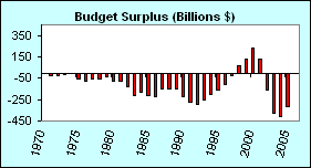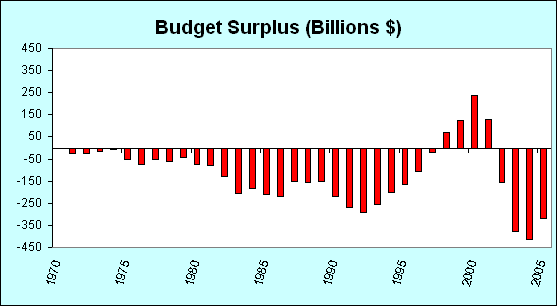Budget deficits increased significantly in the mid-1980s and peaked in the early 1990s, as illustrated in the figure titled Budget Surplus. Economists blame several factors for the increased deficits of the 1980s. First, outlays for government entitlement programs, especially Social Security and Medicare, surged in the 1980s. Second, the productivity growth rate of the economy slowed somewhat inexplicably after 1973 (see Chapter 18, Economic Growth and Productivity), reducing the growth of the nation's tax base. Third, President Reagan simultaneously passed tax cuts and increased significantly expenditures for defense. Congress rejected most of the planned non-defense budget cuts that Reagan proposed. The combination of higher spending and lower tax revenues led to higher budget deficits. The deficits of the early 1990s were compounded by the recession of 1990-91. Not until 1993 did deficits begin to shrink. Because of the strong U.S. economy in the latter half of the 1990s, budget deficits shrunk rapidly. In fact, the U.S. ran surpluses between 1998 and 2001. The surplus topped $236 billion in 2000 and $128 billion in 2001. In 2002 the more typical deficit pattern emerged again. The $378 billion deficit in 2003 and the $413 billion deficit in 2004 are partly due to the recession in 2001, the stock market decline, tax cuts enacted under President Bush, and increased government spending to combat terrorism and invade Iraq. The 2004 budget deficit of $413 billion is in nominal terms the largest deficit in U.S. history, although as we explain below, deficits relative to the size of U.S. income were larger in the 1980s.