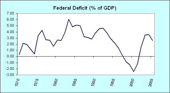 Overall Assessment of the Current Federal Budget SituationThe general consensus of economists on the current state of U.S. deficits and debt may be summed up as follows. Is there an impending crisis? No, if by crisis we mean that today's deficits unduly harm prospects for future economic growth. Could there be a crisis in the future? Possibly. The large deficits incurred in the mid- to late-1980s were harmful to the extent that they crowded out private investment and replaced that investment with consumption spending. However, there is disagreement over how large the crowding-out effect was and whether or not crowding out even occurred at all. The more accepted--but still controversial--story is that the large deficits of the 1980s led to a strong U.S. dollar, which reduced net exports (see Chapter 7, Foreign Exchange and the Balance of Payments) and led to the twin deficit problem.The recent surpluses notwithstanding, the terrorist attacks of September 11, 2001 and the recession in that year quickly turned the surpluses into a significant deficit. The $318 billion deficit in 2005 stands in stark contrast to the surpluses recorded just a few years ago. In addition, the looming demographic and health care issues will strain the federal budget even more. As the U.S. population ages, Social Security and Medicare payments will increase. Given those structural pressures and a business cycle contraction, the government could find itself in an unpleasant budget situation in the not-so-distant future. Ultimately, the condition of the federal budget depends on the strength of the U.S. economy. If the economy grows at a strong pace over time, the government's tax base rises quickly, alleviating budget pressures.