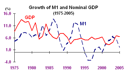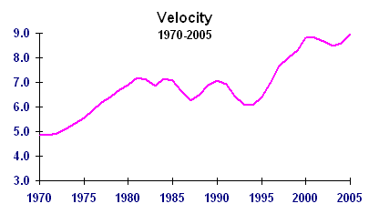 Which school of thought is right, Keynesians or Monetarists? The answer hinges on the two assumptions described above: the stability of velocity and the efficiency of markets. We address the first of these two assumptions here. The figure titled "Velocity" plots velocity of M1 from 1970 to 2005. In the 1970s velocity was not stable, but at least it was increasing at a fairly constant rate.