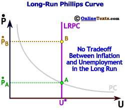 Most economists now agree that in the long run there is no tradeoff between inflation and unemployment. Since in the long run the economy produces at potential output (YP)--the point at which the unemployment rate is at the natural rate--the long-run Phillips curve is simply a vertical line at the natural rate of unemployment, U*. As the figure titled "Long-Run Phillips Curve" illustrates, any level of inflation is consistent with the natural rate of unemployment. For example, at point A the unemployment rate is at U* and the inflation rate is |