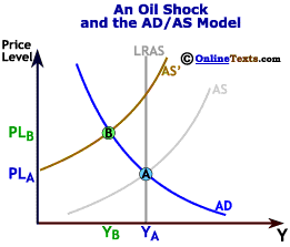 Shifts in the AS CurveWhen the Aggregate Supply curve shifts, we can get very different results in the Phillips curve. For example, let us take the case of an oil shock. As we see in the left-hand chart titled "An Oil Shock and the AD/AS Model", an oil shock shifts the Aggregate Supply curve to the left and the result is stagflation--a rise in both inflation and unemployment. On the Phillips curve plotted in the right-hand chart titled "Phillips Curve Response to an Oil Shock", the oil shock produces a movement to the northeast of point A as both unemployment and inflation increase. |