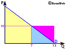 For each CD she buys beyond the 7th, she still pays 10, but according to her demand curve, D, her marginal willingness to pay, or her marginal utility, is less than 10 for each CD beyond the 7th. She's paying 10 for CDs that are worth less than that to her. If she buys 13 CDs instead of 7 her utility increases only by an amount equal to the blue area, but she pays an amount equal to the blue + magenta area. Buying the extra CDs makes her worse off by an amount equal to the magenta area.