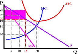 The amount of profit (a negative number since it is loss) is easily computed. This rectangle has a height of 7 (27-20 or ATC - P) and a width of 15 (amount of output) so loss is - 7x15 = 105.