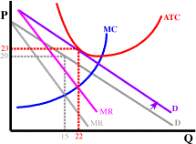 Since this is a market with free entry and exit, losses will lead to exit from the industry. From the standpoint of the remaining firms, their demand and marginal revenue curves shift out since they now face fewer competitors (it also probably becomes a bit more inelastic). Exit will continue until profits are zero. This increase in demand means that remaining firms will end up selling more at a higher price. In the graph to the right we show price increasing from 20 to 23 and output increasing from 15 to 22.