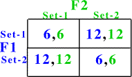 This may be because the payoff matrix is like the one to the right. Notice that there are two Nash Equilibria here both involving having different sets of features. This makes it more difficult for consumers to compare competing products direction and so direct price competition isn't as great an issue and both firms can maintain higher prices and higher profits.