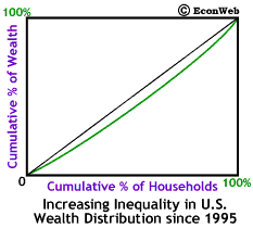 Since 1995, the number of households with net worth in excess of $US 1 million has increased by a third, to over 4 million households; the rate of increase in households with net wealth over $US 10 million is even greater. However, the same increases in wealth have not accrued to the rest of the U.S. population. While the wealthiest 10% are better off than before, the other 90% of U.S. households have seen their wealth fall. The run-up of the stock market over the last few years has lead to greater inequality in the distribution of wealth in the U.S. This is shown (in exaggerated form) by an increased bowing out of the Lorenz curve, shown to the right. Click here for more information on the Lorenz curve and the Gini coefficient.