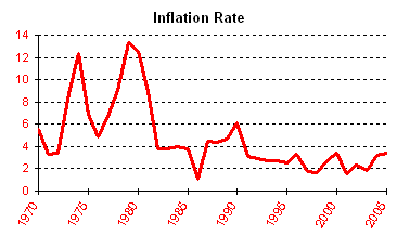 aggressively attacked inflation, bringing the rates down from double digits to four percent and under by the mid-1980s. The figure titled "Inflation Rate" plots inflation rates between 1970 and 2005. Inflation in 2005 was 3.4 percent.