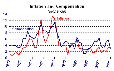 The figure titled "Inflation and Compensation" tracks nonfarm business compensation (wages and benefits) and inflation from 1960 through 2005. Before 1973, compensation generally increased faster than prices. Between 1973 and 1995, real wages declined in many years, though on average, real wages were stagnant. Between 1996 and 2004, compensation was once again consistently higher than inflation; therefore, real average incomes rose on average during that period. Nevertheless, the high and persistent wage gains common before 1973 remain elusive. In 2005 real wages increased about 2.8 percent while inflation rose by 3.4 percent.