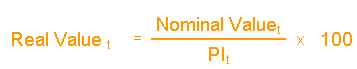 Deflating Nominals to Reals A nominal value is not corrected for the effects of inflation. The nominal value is the "sticker price." It is the price of the good or service using current dollars. A real value is the value of a good or service that is corrected for the effects of inflation For example, suppose that a coat costs $50 in the year 1997 and $52 in 1998. In real terms, in which year is the coat less expensive? Part of the reason that the coat seems to be more expensive in 1998 is because the price level has increased. To make a meaningful comparison, however, we have to remove this price effect. We must deflate the nominal values to real values. Deflating is the process of deriving the real value of some nominal value by dividing by an appropriate price index. The resulting real value will be expressed in terms of the purchasing power of the currency in the base year. The formula is the following: